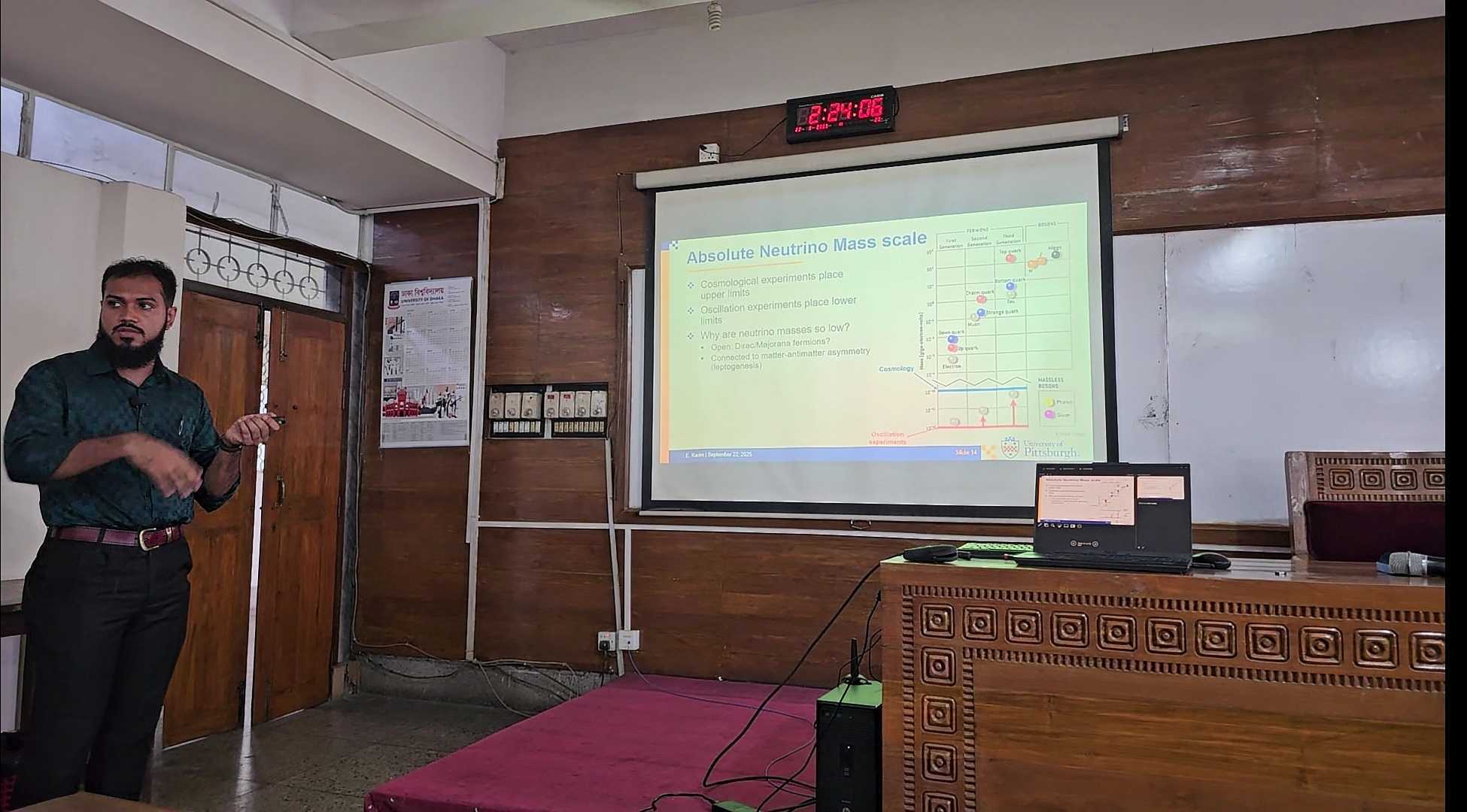 Adil gives a seminar on neutrino mass measurement at his alma mater, Dhaka University.